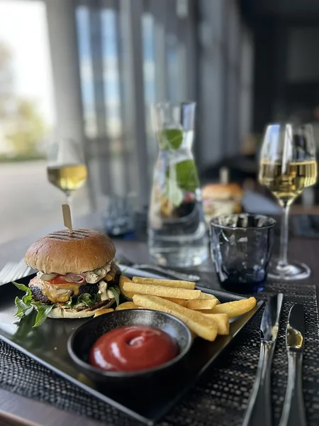 Beef or chicken burger with french fries