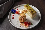 Pistaatsia-šokolaadikook veriapelsinigeeli ja musta küüslaugu-vaniljejäätisega