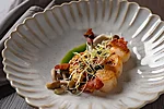 Grillitud kammkarbid krõbeda prosciutto, vürtsika salsa ja maapirnikreemiga