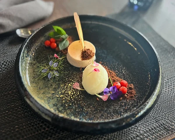 Pihlakapannacotta, leedriõiesorbee, šokolaadimuld ja tuile-küpsis